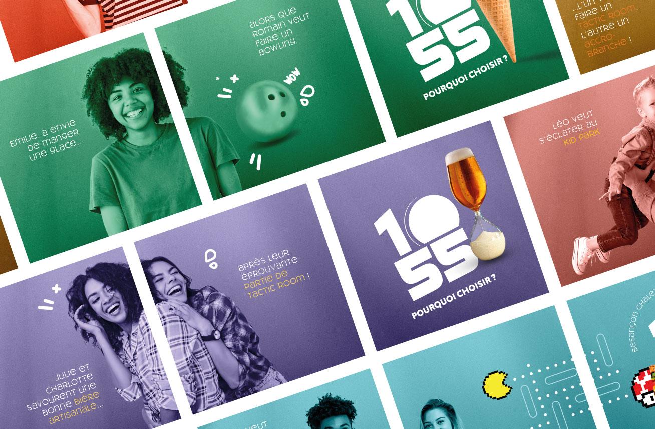 Vous connaissez le 10·55 ? Non, ce n'est pas une heure du matin un peu trop matinale. Né à Lons-le-Saunier à l'adresse éponyme du 1055 rue de la Lième, ce concept a conquis toute la région, il révolutionne le concept de loisirs en mixant activités et restauration sous un même toit. Notre mission ? Capturer l'ADN survitaminé du 10·55 et le décliner partout – PARTOUT ! Affiches, réseaux sociaux, signalétique, supports digitaux... Chaque création explose de couleurs pop et d'énergie décomplexée. Pas de demi-mesure, pas de tons pastels timides : ici, on pousse les curseurs à fond !